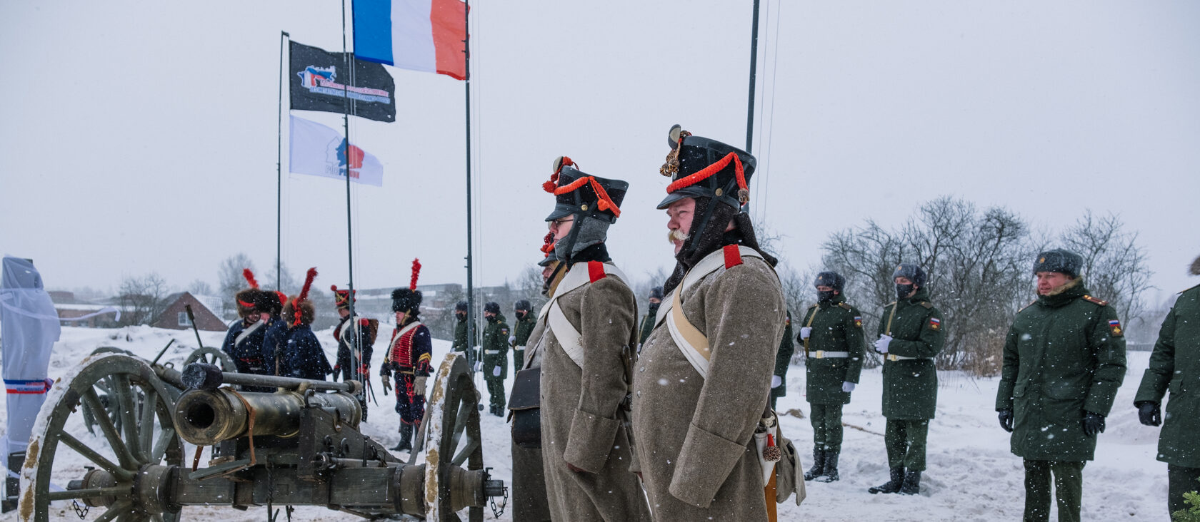 La cérémonie a eu lieu avec la participation de l'association de reconstitution historique (ROSREKON) qui ont envoyé 70 figurants en uniformes militaires Russes et Français de l'époque, des coups de canon ont été tirés et le ténor d'opéra Yuri Rostotsky a chanté les deux hymnes. La cérémonie a été suivie par l'attaché de défense à l'Ambassade de France en Russie, le général de brigade Ivan Martin, le prince Pontecorvo Joachim Murat, le Grand Duc Georgi Romanov, une descendante directe du Maréchal Russe Mikhail Koutouzov (madame Yulia Vasilievna Khitrovo), des diplomates de l'ambassade de France, des représentants de l'administration de la formation municipale du district de Vyazemsky, le ministère de la Défense, le directeur de l'Institut d'archéologie de l'Académie des sciences de Russie Monsieur Makarov et d'autres invités d'honneur et personnalités publiques.
